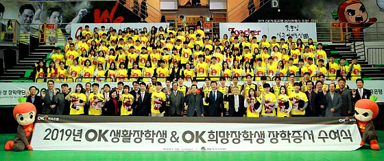 OK배정장학재단은 지난 24일 경기도 안산시 상록수체육관에서 '2019 OK생활Ÿ희망장학생 장학증서 수여식'을 가졌다. OK희망장학생은 고등학교 졸업 시까지, OK생활장학생은 학부 또는 대학원 졸업 시까지 학년에 상관없이 후원 받는다.