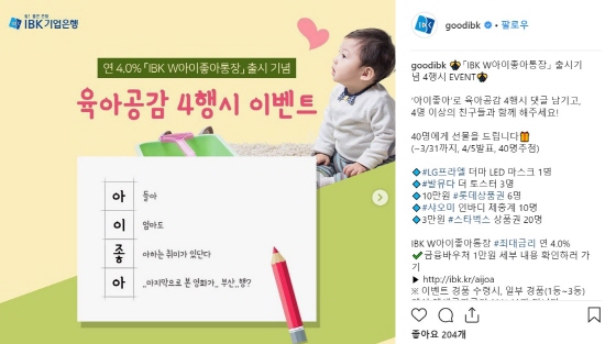 IBK기업은행은 'IBK W아이좋아통장' 출시를 기념해 '아이좋아 4행시 댓글 이벤트' '주택청약저축 콜라보 이벤트'를 진행한다고 6일 밝혔다.