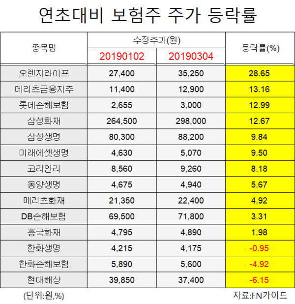 오렌지라이프 다음으로는 메리츠금융지주 주가가 상승했다. 연초보다 13% 가량 올랐다. 롯데손해보험·삼성화재·삼성생명·미래에셋생명·코리안리·동양생명·메리츠화재가 뒤를 이었다. 이같은 보험주 주가 상승은 배당주로서의 기대감을 시장에 제공했기 때문이란 판단이다. 자본시장에 따르면 보험주 배당수익률은 코스피 평균 배당 수익률인 2.7% 보다 높은 것으로 파악돼 올해 보험주가 배당주로 부각될 것으로 점쳐졌다.