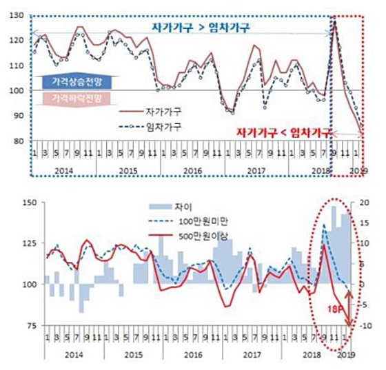 한국은행에 따르면 2014년 이후 지난해 9·13 대책 이전까지는 자가가구의 주택가격 전망지수가 임차가구보다 높게 나타났으나 9·13 대책 발표가 예고된 2018년 8월에 이 지수가 자가가구 108, 임차가구 110을 기록하며 2014년 이후 처음으로 수치가 역전됐다.