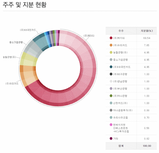 우리은행은 BC카드에 영향력을 줄 수 있는 관계라는 분석이다. 당초 우리은행은 BC카드의 지분 27.65%를 가진 최대주주였으나, 2011년 이 중 20%를 KT에 매각하면서 KT가 BC카드의 최대주주로 올라서게 됐다. 남은 지분 7.65%는 2013년 우리은행에서 분사된 우리카드가 승계했다. 현재 BC카드의 1대주주는 KT, 2대주주는 우리카드다.