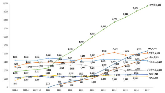 2017년 유료방송가입자는 3161만명으로 전년 대비 5.5% 증가한 가운데 IPTV 가입자 수(1433만명)가 최초로 SO 가입자(1404만명)를 역전했다. 전체 유료방송 가입자 중 IPTV 비중은 45.3%, SO는 44.4%를 차지했다.