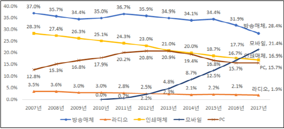 매체별로는 방송.인쇄매체의 광고비 비중 감소와 온라인광고(모바일+PC) 비중의 성장세가 지속된 가운데 온라인광고 비중이 37.1%로 방송광고(TV+라디오) 비중(30.3%)을 추월했다.