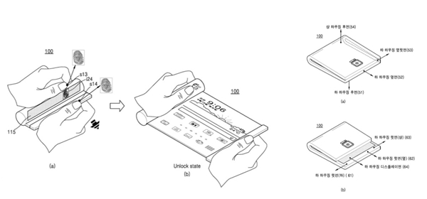 특히 롤러블 디스플레이의 작동원리와 바형태의 '디바이스(디스플레이가 말려있는 상태로 탑재된 영역)'가 설명된 부분이 눈길을 끈다. 해당 특허에 따르면 디바이스의 화면부를 잡아 당김에 따라 디스플레이는 펼쳐질 수 있다. 삼성전자측은 디바이스에 마련된 소정 버튼을 누르면 화면부가 말린 상태로부터 펼쳐진 상태로 변경될 수도 있다고 설명했다.