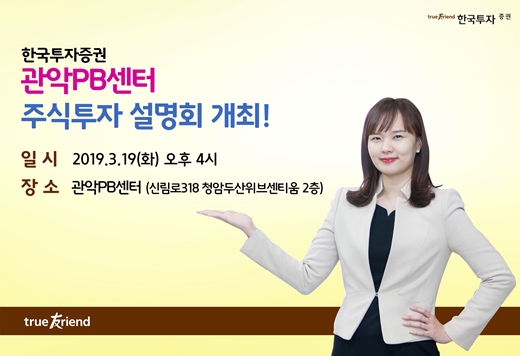 한국금융지주 자회사 한국투자증권(사장 정일문)은 오는 19일 신림동 관악PB센터에서 개인 투자자를 위한 주식투자 설명회를 개최한다고 15일 밝혔다.