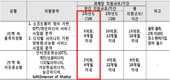 자유공모 과제는 OTT, 개인·소셜미디어, 디지털사이니지, IoM(Internet of Media), 가상현실미디어, 실감미디어 등 스마트미디어 6개 분야에 대해 연간 최대 2억원을 기술개발 사업화에 지원할 계획이다.