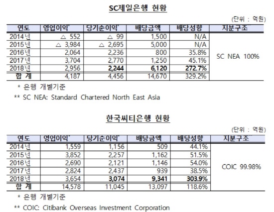외국계은행인 SC제일은행과 한국씨티은행이 압도적인 배당을 하면서도 추가 투자나 사회적 책임을 다하지 않고 있다는 주장이 제기됐다.