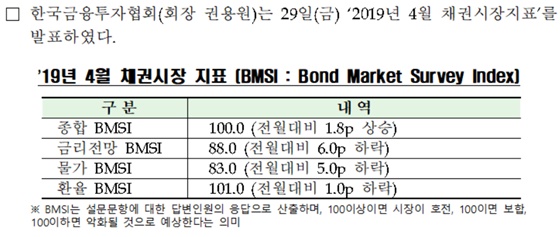 금융투자협회는 지난 18∼21일 채권 관련 종사자 200명을 설문 조사해 '2019년 4월 채권시장지표(BMSI)'를 산출한 결과 종합 지표가 전월 대비 1.8포인트 상승한 100.0으로 집계됐다고 29일 밝혔다.