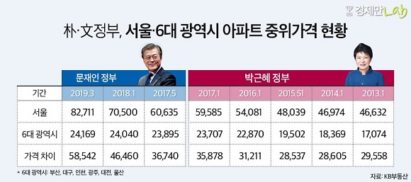 박근혜 정부 시절 서울과 6대 광역시 간의 아파트 중위가격 격차는 평균 3억원대로 나타났지만, 문재인 정부가 들어서면서 부동산 규제를 쏟아냈지만, 서울 아파트 가격만 더 치솟아 오르면서 지역간 아파트 격차는 더 커졌다.