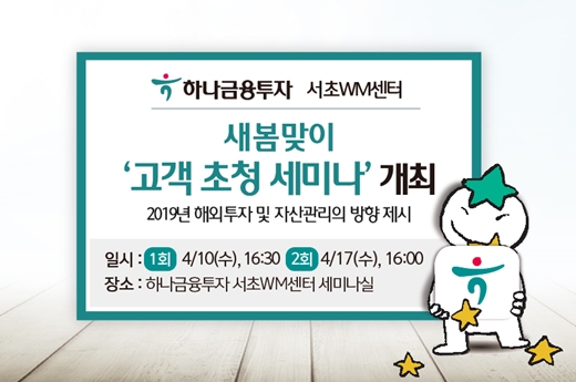 하나금융투자 서초WM센터(교대역 7번출구)는 해외투자 및 자산관리에 대해 관심 있는 손님을 대상으로 센터 내 세미나실에서 2회에 걸쳐 고객 초청 세미나를 실시한다고 4일 밝혔다.