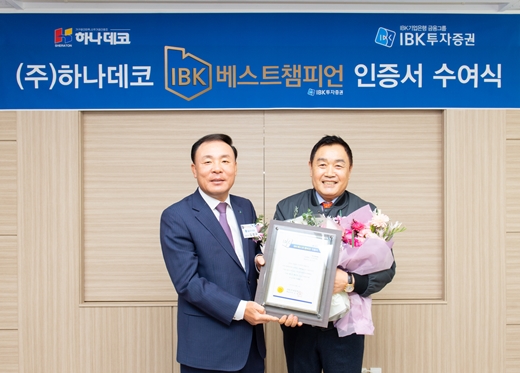 IBK투자증권(대표이사 김영규)은 경기도 화성시 하나데코(대표이사 이기덕)와 인천광역시 연수구 아들과딸(대표이사 조진석)을 각각 방문해 IBK베스트챔피언 인증서를 전달했다고 11일 밝혔다.