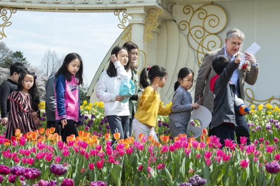 튤립축제가 한창인 경기도 용인 에버랜드에 지난 13일 특별한 외국인 선생님이 방문했다. 현 주한 네덜란드 대사인 로디 엠브레흐츠(Lody Embrechts)가 일일 튤립 선생님으로 변신한 것.