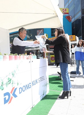 ▶ 장세욱 동국제강 부회장(왼쪽)이 15일 서울 마포에서 한 시민에게 철로 만든 미니 화분을 나눠주고 있다.ⓒ동국제강 동국제강은 15일 홍익대 걷고싶은거리에서 '그린캠페인'을 실시했다. 이번 캠페인은 생활 속 고철 기증 및 환경 관련 퀴즈 맞추기 등 다양한 이벤트 참여를 통해 선착순 600명에게 철제 화분과 마우스패드를 증정하는 방식으로 진행됐다. 행사 때 제공된 마우스패드는 동국제강의 건축용 고급 컬러강판 브랜드인 럭스틸로 제작됐다. 동국제강은 철의 친환경성을 알리기 위해 지난 2017년부터 지속적으로 그린캠페인을 개최해왔다.