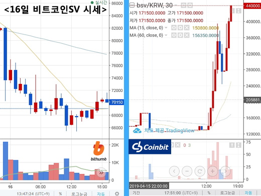 상장폐지 소식이 알려지자 대다수 암호화폐 거래소의 비트코인SV 시세는 급락했다. 16일 빗썸 내 비트코인SV 시세는 우하향 곡선을 그리면서 장중 최저 6만7450원에서 최고 7만2450원을 기록했다.