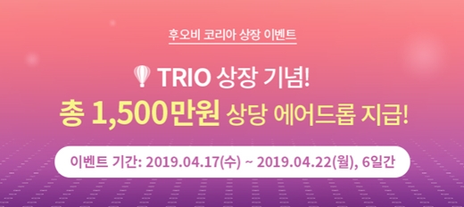 17일부터 22일까지 트리피오 상장 기념 이벤트도 진행한다. 3만TRIO 이상 입금한 선착순 150명에게는 1만TRIO(약 3만원)가 지급된다. 또한 거래 시작 기준 순매수량 상위 5명에게 총 333만2000TRIO(1000만원 상당)을 차등 지급하는 이벤트도 함께 진행한다.