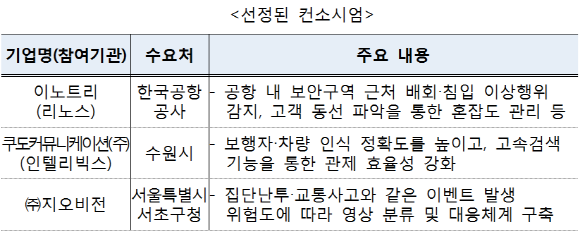 올해에도 사회안전분야(구도심 안전, 범죄 예방 등)에 3개 시범사업이 선정됐다. 선정된 3개 컨소시엄은 총 9억2000만원원의 사업비를 지원받아 시범사업을 추진할 예정이다.