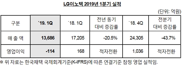 LG이노텍 관계자는 "스마트폰 부품 수요가 감소하는 1분기에 접어들며 카메라모듈과 모바일용 기판 등의 판매가 줄었으며 신모델 대응을 위한 고정비 증가 등의 영향으로 실적이 감소했다"고 말했다.