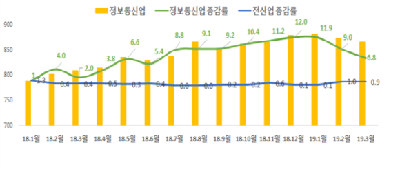 전 산업의 상용종사자는 3%(1410만명) 증가했지만 정보통신업의 상용종사자는 9.7%(73만명)로 3배 이상 늘어났다.