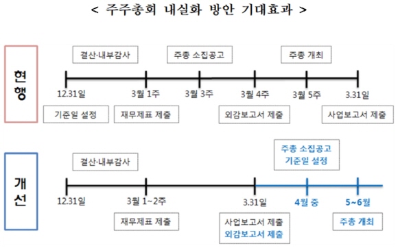 특히 주총 소집통지시 사업보고서 및 감사보고서를 참고서류에 포함하도록 의무화함으로써 주주의 내실 있는 의결권 행사를 지원하고 3월이 아닌 5~6월까지 주총이 분산될 수 있도록 유도한다는 계획이다.