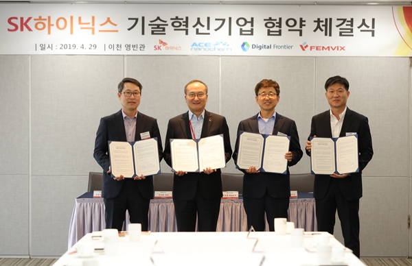 SK하이닉스가 29일 경기도 이천 본사 영빈관에서 기술혁신기업 협약식을 열고 디지털프론티어, 펨빅스, 에이스나노켐을 올해 기술혁신기업으로 선정했다고 밝혔다.