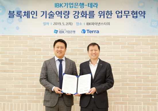 IBK기업은행은 을지로 IBK파이낸스타워에서 블록체인 핀테크 기업 테라와 '블록체인 기술역량 강화를 위한 업무협약'을 체결했다고 2일 밝혔다.