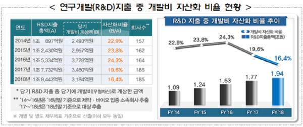 제약·바이오업종 상장사 185개사의 개발비 자산화 비율이 2016년 24.3%에서 2017년 19.6%, 2018년 16.4%로 점차 감소하고 있는 것. 금감원은 우려했던 연구개발(R&D) 활동 위축도 발견되지 않아 개발비 회계처리 투명성과 투자자 보호를 함께 높인 것으로 해석했다.