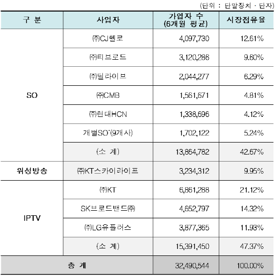 LG유플러스와 CJ헬로의 합산 점유율은 24.54%로 상반기 대비 0.11%p 늘어나고 SK브로드밴드와 티브로드 역시 23.92%로 0.09%p 증가한다.
