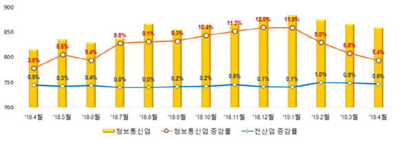 정보통신업 취업자 수는 전체 산업(2704만명)의 3.2%에 불과하지만 증가 규모는 전체 산업 취업자 증가 규모(17만명)의 25.9%를 차지하고 있다.