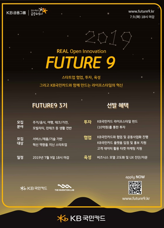 KB국민카드는 미래 생활 혁신을 선도할 신생 창업기업을 발굴·육성하는 '퓨처나인(FUTURE9)' 3기 프로그램에 참여할 스타트업을 모집한다고 11일 밝혔다.