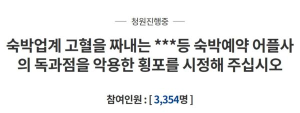 최근 숙박업자들은 청와대 국민청원에 숙박앱의 횡포를 고발하는 글을 올렸다.