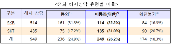 방통위는 두 회사의 해지 상담 녹취록 949건을 조사한 결과 이용자가 명시적으로 거부했음에도 전화를 걸어 추가적인 혜택 제공 등을 제시하면서 해지철회나 재약정을 유도한 249건을 확인했다.