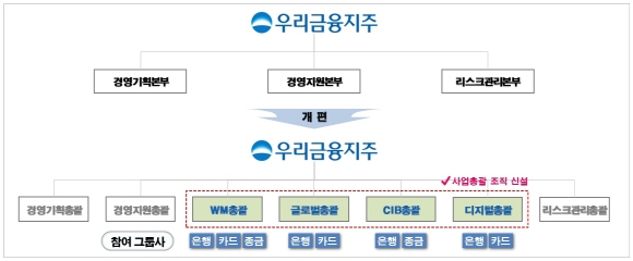 우리금융 관계자는 "이번 조직개편을 통해 그룹사간 시너지 창출을 위한 책임경영과 의사결정 효율성을 높이고 사업 포트폴리오 확충에 대비한 그룹사간 협업체계 기반을 확립하게 됐다"며 "그룹사간 유기적 협력을 바탕으로 새로운 사업기회를 발굴하고 체계적인 종합금융서비스 제공을 통해 대고객 서비스 역량을 극대화하겠다"고 말했다.