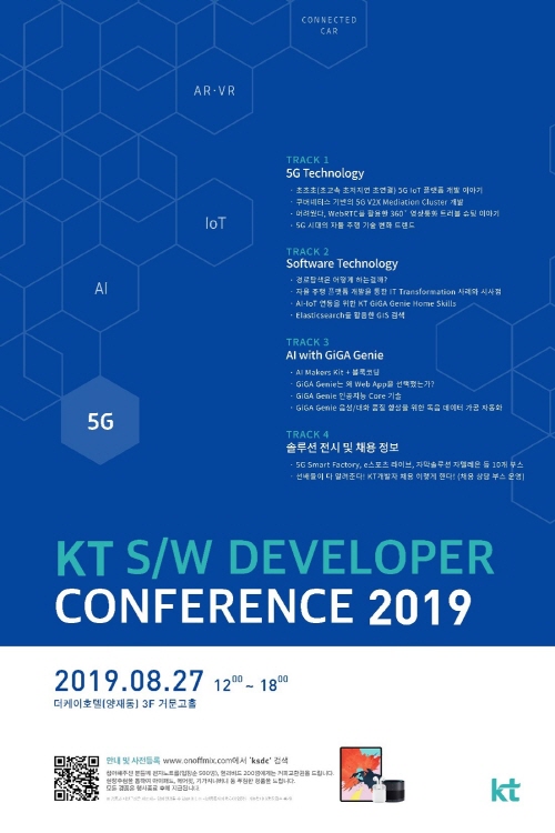 KT의 5G, 인공지능(AI), 커넥티드카, 지리정보시스템(GIS) 서비스 상용화를 위해 소프트웨어 개발에 참여한 개발자들이 직접 발표에 참여할 예정이다. 빠르게 변하고 있는 ICT 환경 속에서 다양한 신기술과 솔루션을 개발하며 겪은 고민과 개발 노하우를 전달한다.
