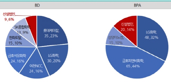 국내 BPA 생산능력은 LG화학 45만톤(年産), 금호피앤비화학 45만톤, 삼양이노켐 15만톤 등 총 105만톤 규모다. 금호피앤비화학은 2021년 하반기 완공을 목표로 BPA 20만톤 증설 공사를 진행중이다.