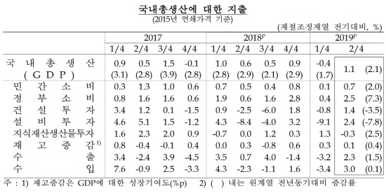 2분기 GDP가 1.1% 상승하면서 한은이 상반기 성장률로 추정했던 1.9% 달성은 가능할 것이란 얘기도 나온다. 앞서 한은은 상반기 GDP 성장이 1.9%를 달성하기 위해선 2·4분기 GDP 증가율이 1.0%는 돼야 한다고 밝힌 바 있다.
