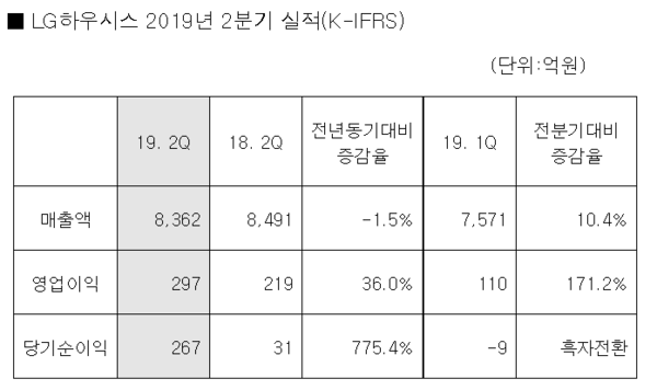 LG하우시스의 2분기 영업이익은 원화 약세에 따른 환율효과와 원재료 가격 하락, 그리고 제조혁신 및 비용효율화를 통한 수익성 개선이 주효했다. 매출은 주택 매매 감소로 인한 건설부동산 경기 하락이 부진 요소로 작용했다.