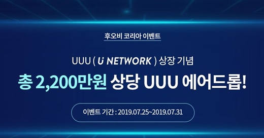 글로벌 디지털 자산 거래소 후오비 코리아(Huobi Korea)는 25일 U Network(UUU) 상장을 기념해 총 2200만 원 상당(시가 0.0085 USD 기준)의 에어드롭 이벤트를 진행한다고 28일 밝혔다.